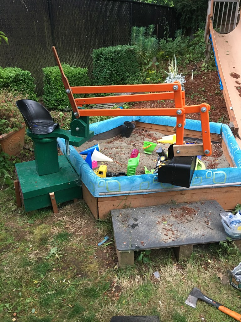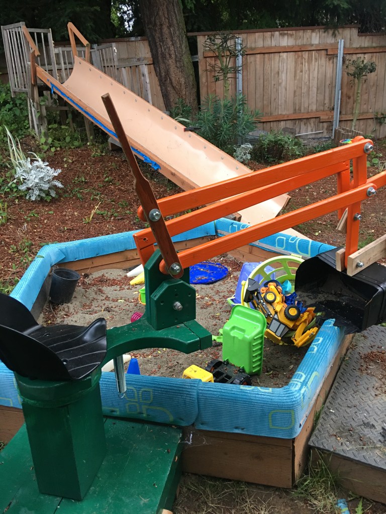 I am constructing a sandbox digger for my grandson. Almost done, still working on some details. Of course, whole thing rotates around seat base.
